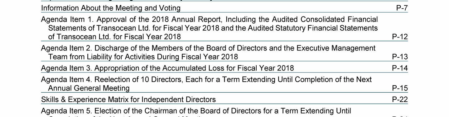 Agenda Item 1. Approval of the 2018 Annual Report, Including the Audited Consolidated Financial Statements of Transocean Ltd. for Fiscal Year 2018 and the Audited Statutory Financial Statements of Transocean Ltd. for Fiscal Year 2018