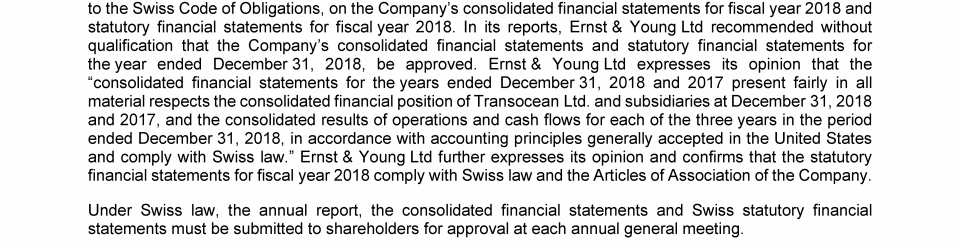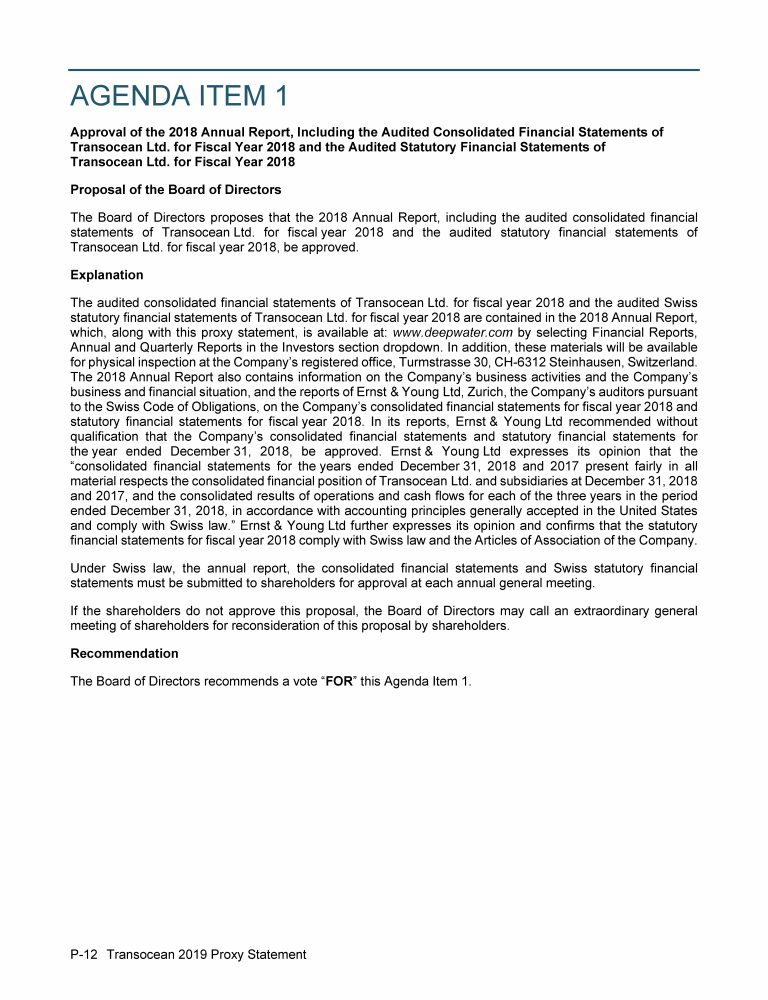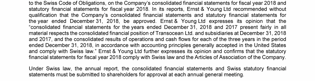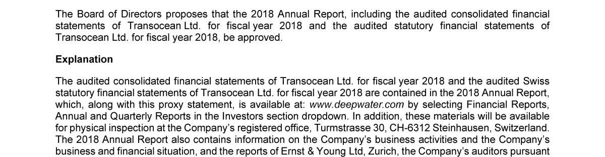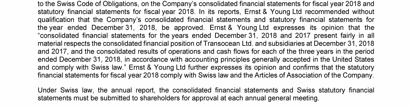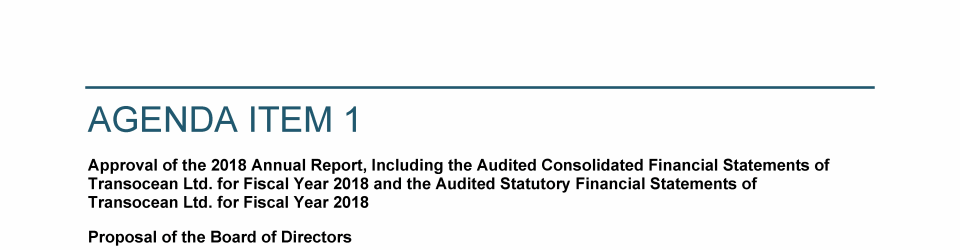 Agenda Item 1. Approval of the 2018 Annual Report, Including the Audited Consolidated Financial Statements of Transocean Ltd. for Fiscal Year 2018 and the Audited Statutory Financial Statements of Transocean Ltd. for Fiscal Year 2018