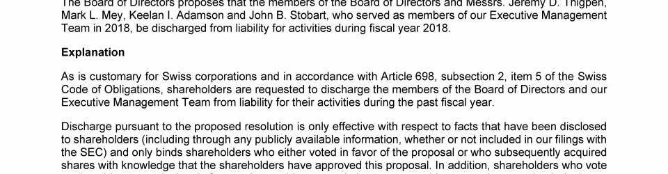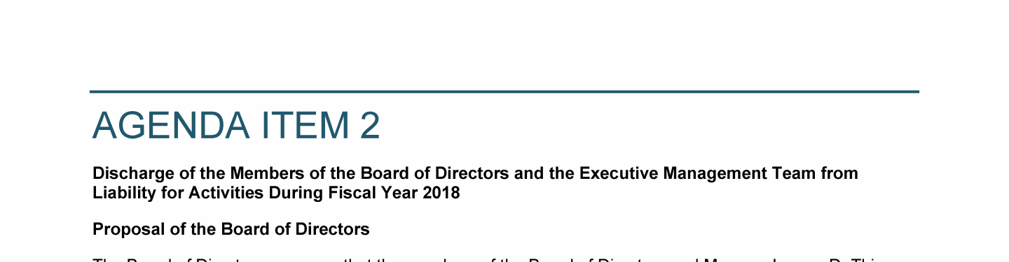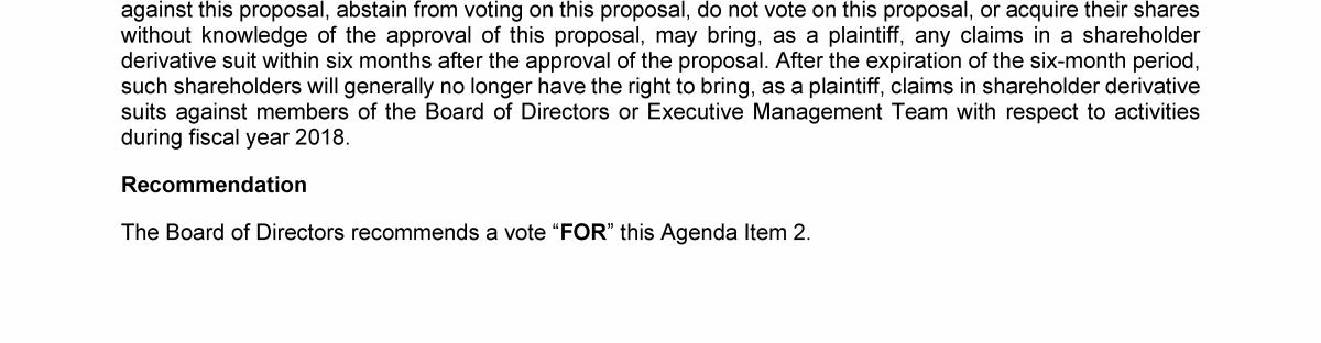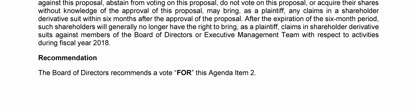 Agenda Item 2. Discharge of the Members of the Board of Directors and the Executive Management Team from Liability for Activities During Fiscal Year 2018