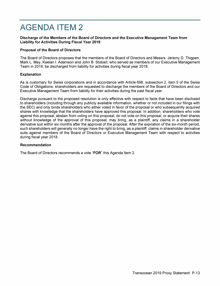 Agenda Item 1. Approval of the 2018 Annual Report, Including the Audited Consolidated Financial Statements of Transocean Ltd. for Fiscal Year 2018 and the Audited Statutory Financial Statements of Transocean Ltd. for Fiscal Year 2018