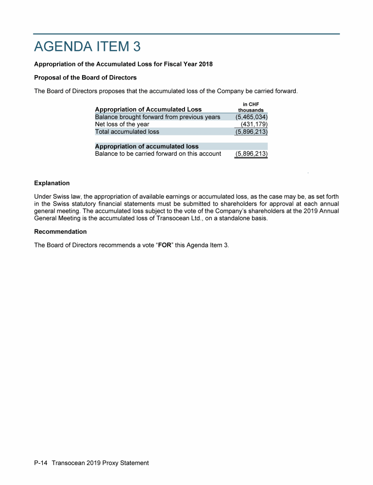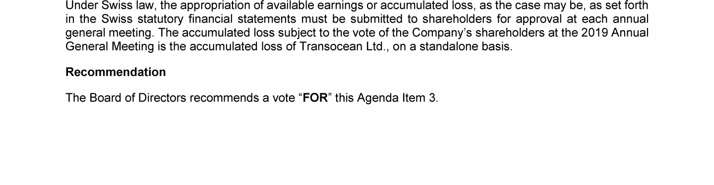 Agenda Item 1. Approval of the 2018 Annual Report, Including the Audited Consolidated Financial Statements of Transocean Ltd. for Fiscal Year 2018 and the Audited Statutory Financial Statements of Transocean Ltd. for Fiscal Year 2018