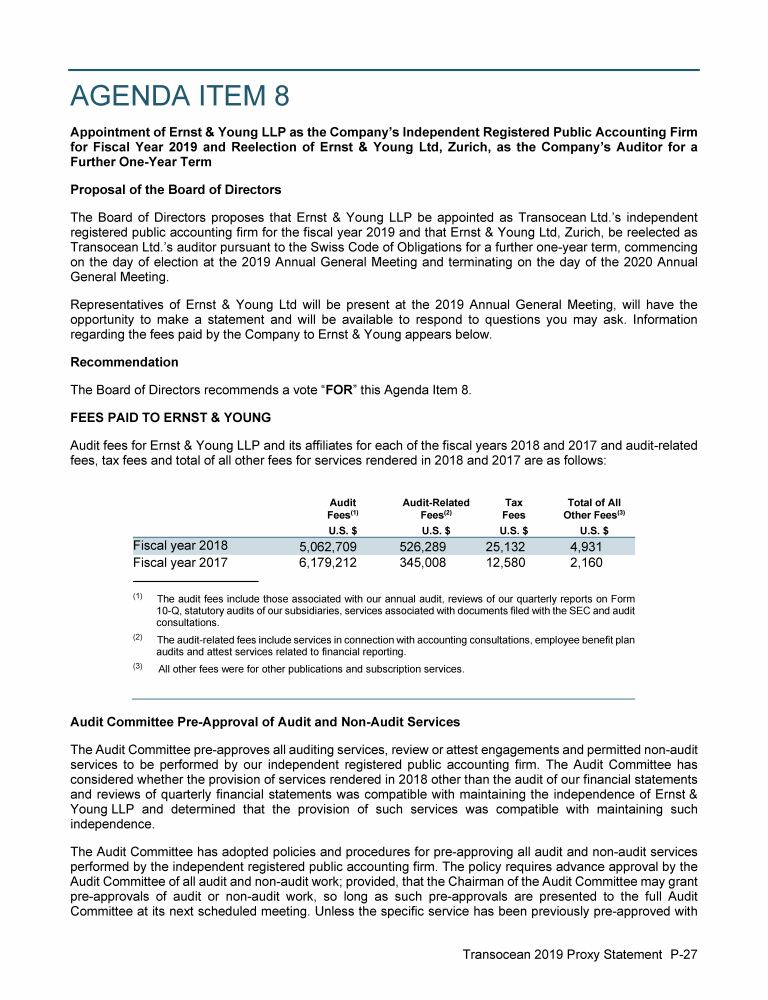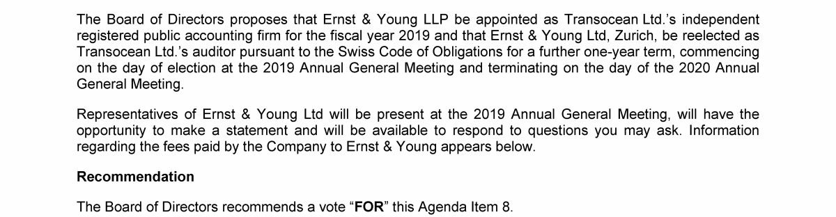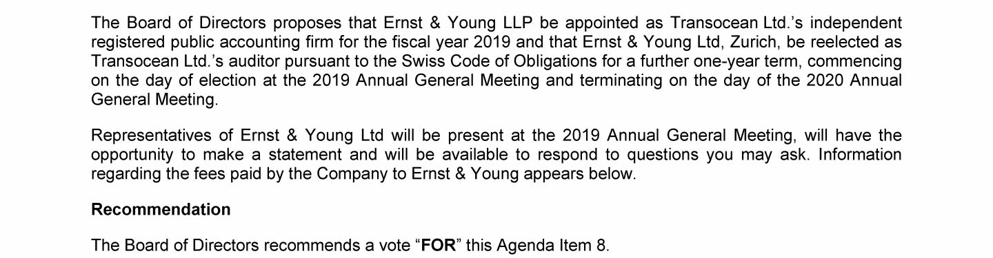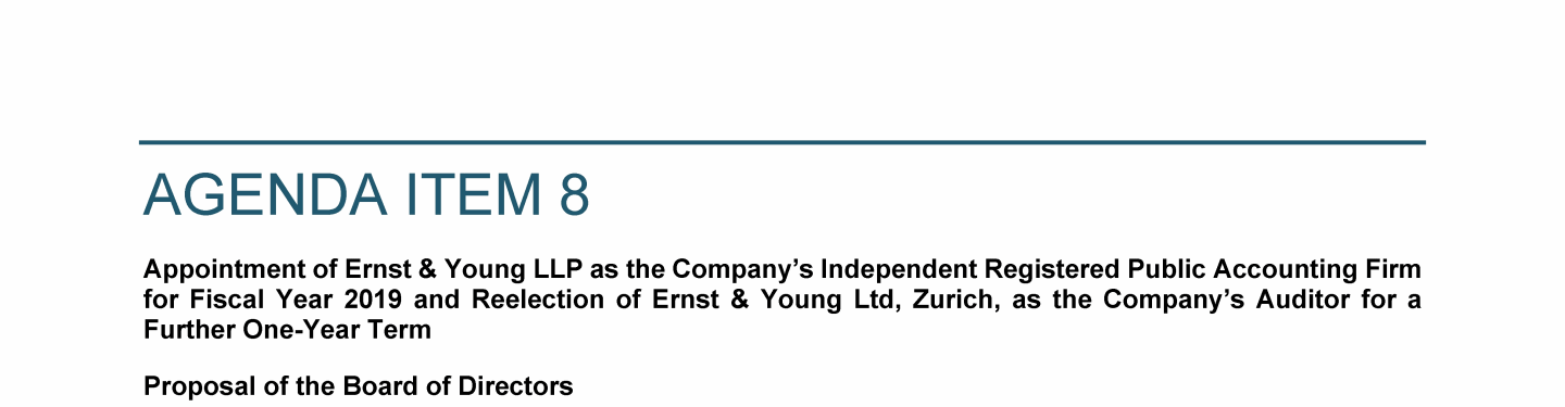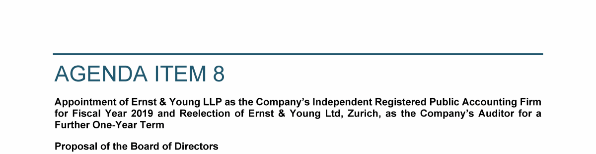 Agenda Item 8. Appointment of Ernst & Young LLP as the Company's Independent Registered Public Accounting Firm for Fiscal Year 2019 and Reelection of Ernst & Young Ltd, Zurich, as the Company's Auditor for a Further One-Year Term
