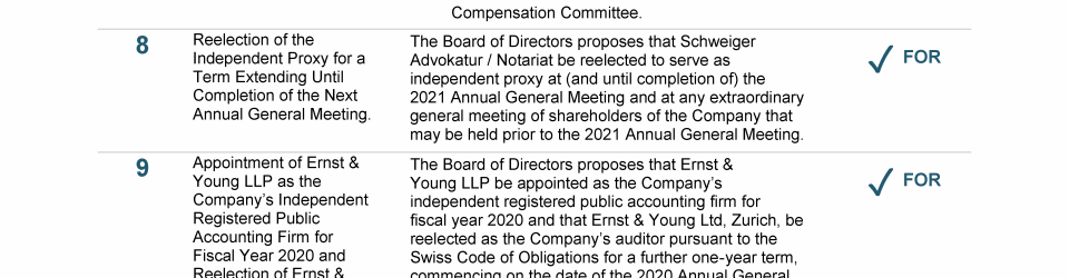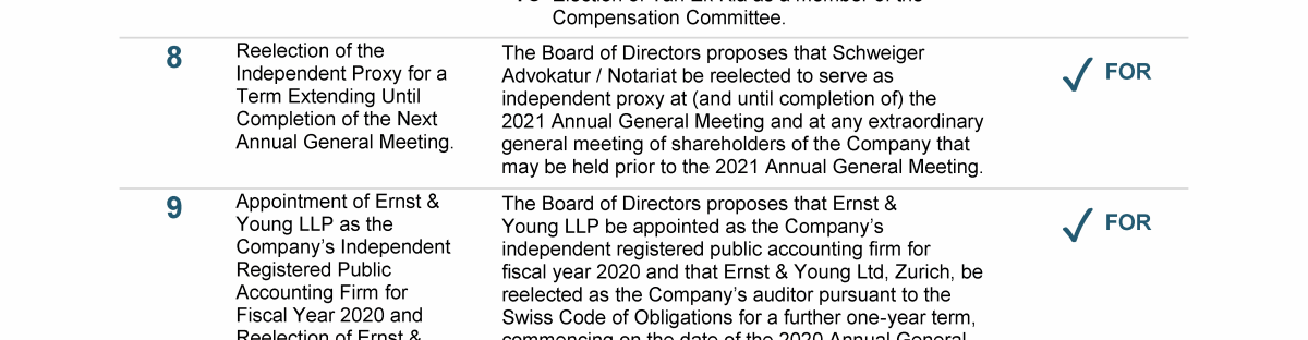 Agenda Item 9. Appointment of Ernst & Young LLP as the Company's Independent Registered Public Accounting Firm for Fiscal Year 2020 and Reelection of Ernst & Young Ltd, Zurich, as the Company's Auditor for a Further One-Year Term