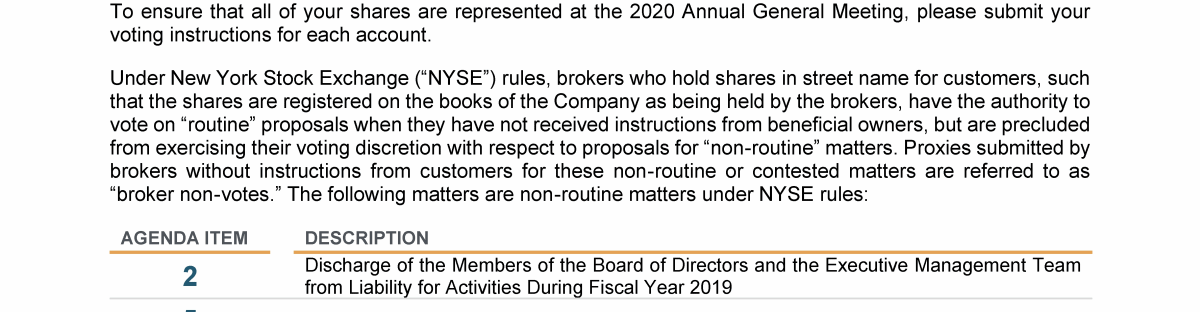 Agenda Item 2. Discharge of the Members of the Board of Directors and the Executive Management Team from Liability for Activities During Fiscal Year 2019