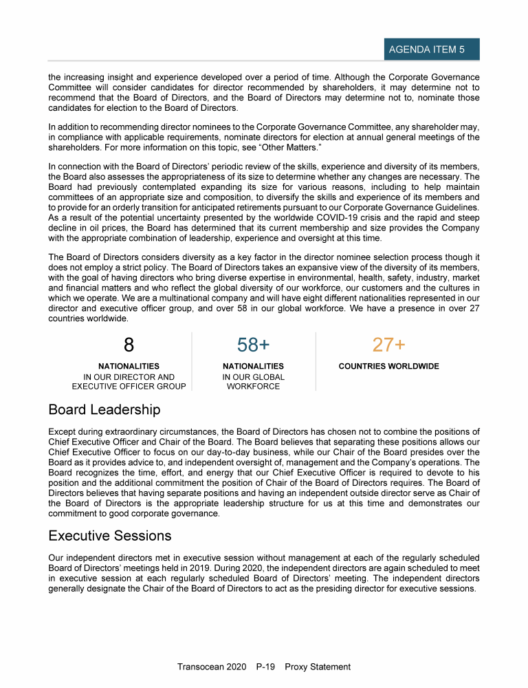 Agenda Item 1. Approval of the 2019 Annual Report, Including the Audited Consolidated Financial Statements of Transocean Ltd. for Fiscal Year 2019 and the Audited Statutory Financial Statements of Transocean Ltd. for Fiscal Year 2019