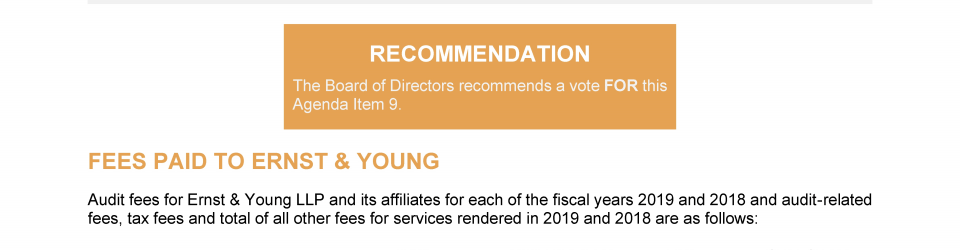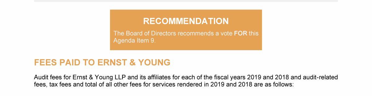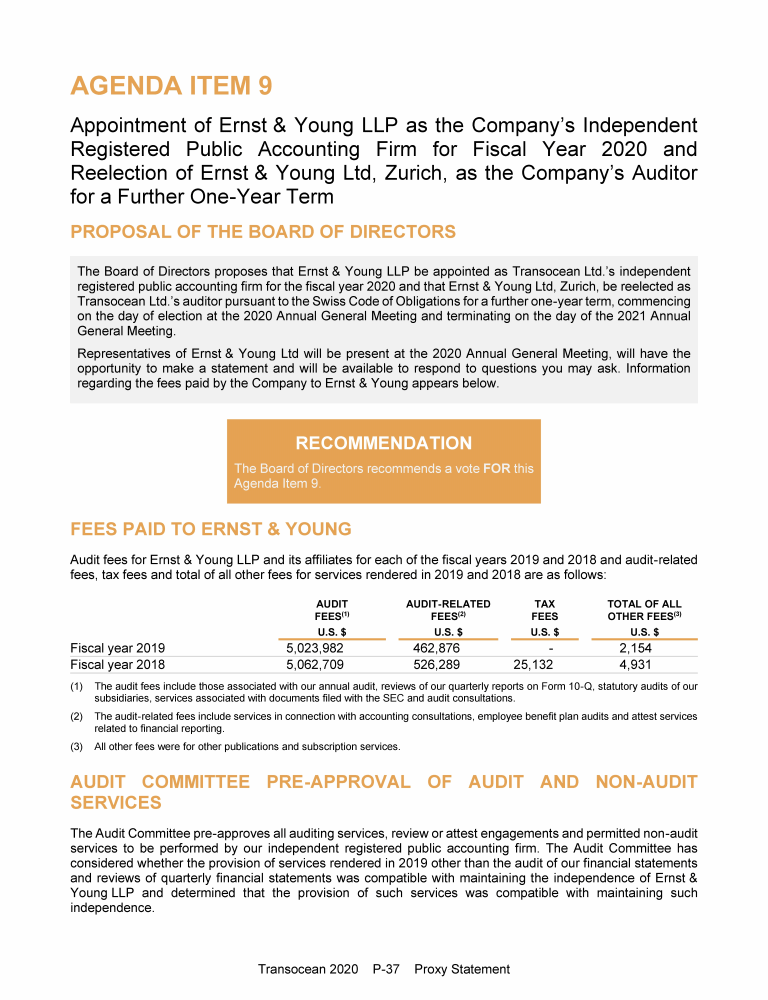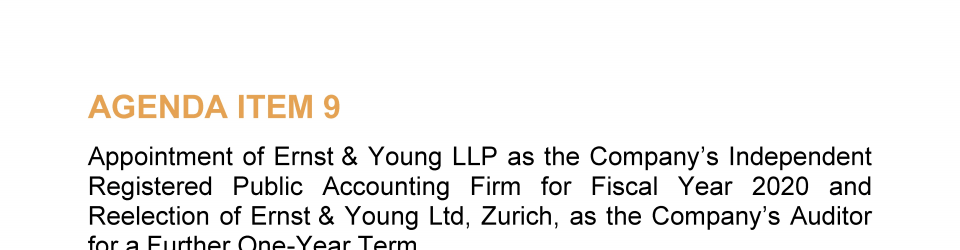 Agenda Item 9. Appointment of Ernst & Young LLP as the Company's Independent Registered Public Accounting Firm for Fiscal Year 2020 and Reelection of Ernst & Young Ltd, Zurich, as the Company's Auditor for a Further One-Year Term