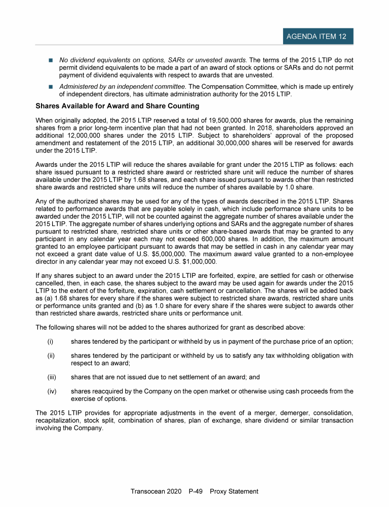 Agenda Item 12. Approval of Amendment and Restatement of the Transocean Ltd. 2015 Long-Term Incentive Plan