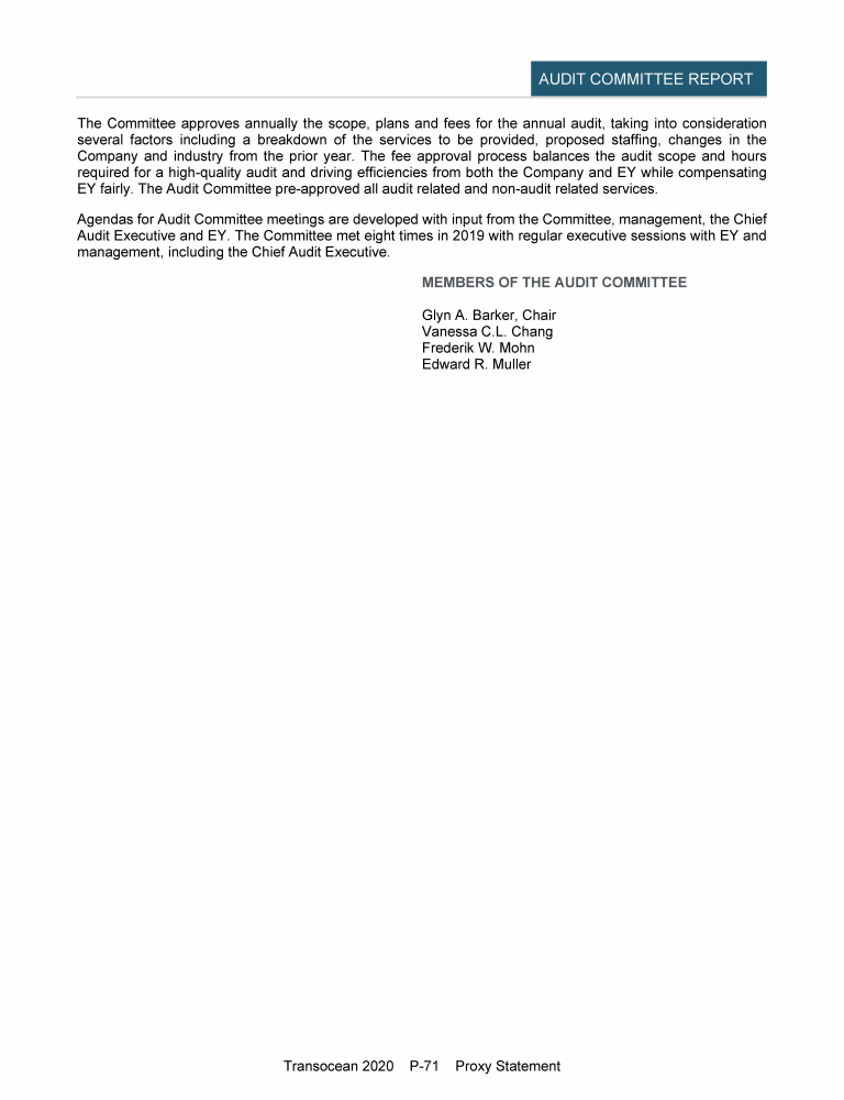Agenda Item 1. Approval of the 2019 Annual Report, Including the Audited Consolidated Financial Statements of Transocean Ltd. for Fiscal Year 2019 and the Audited Statutory Financial Statements of Transocean Ltd. for Fiscal Year 2019