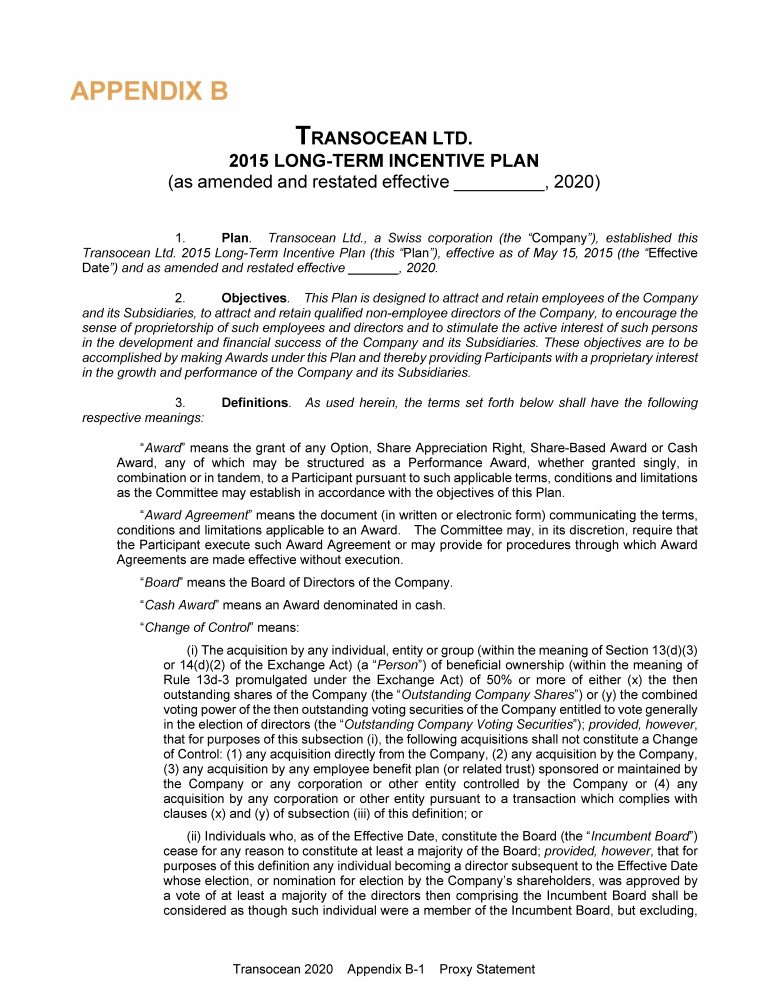 Appendix B - Proposed Amendment and Restatement of Transocean Ltd. 2015 Long-Term Incentive Plan