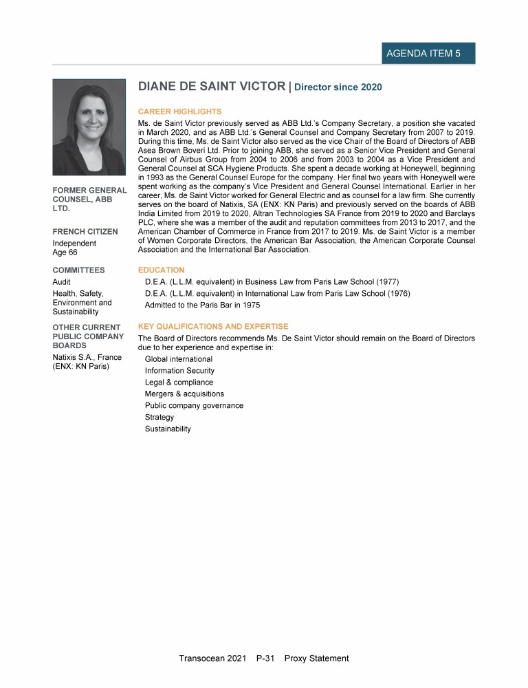 Agenda Item 1. Approval of the 2020 Annual Report, Including the Audited Consolidated Financial Statements of Transocean Ltd. for Fiscal Year 2020 and the Audited Statutory Financial Statements of Transocean Ltd. for Fiscal Year 2020