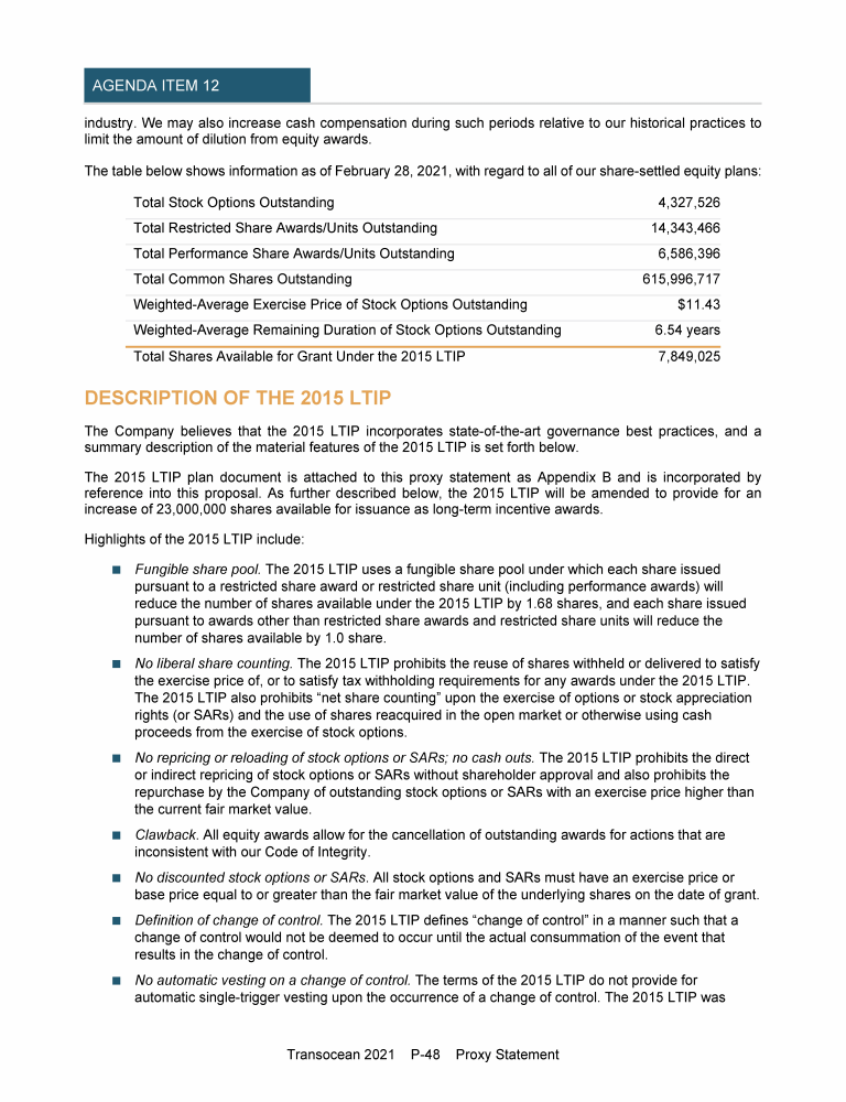 Agenda Item 12. Approval of Amendment and Restatement of the Transocean Ltd. 2015 Long-Term Incentive Plan