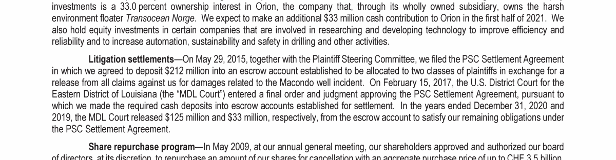 Agenda Item 1. Approval of the 2020 Annual Report, Including the Audited Consolidated Financial Statements of Transocean Ltd. for Fiscal Year 2020 and the Audited Statutory Financial Statements of Transocean Ltd. for Fiscal Year 2020