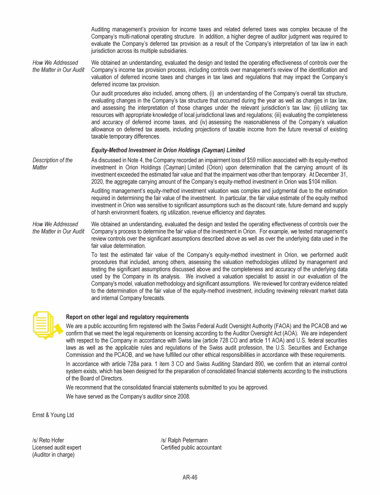Agenda Item 1. Approval of the 2020 Annual Report, Including the Audited Consolidated Financial Statements of Transocean Ltd. for Fiscal Year 2020 and the Audited Statutory Financial Statements of Transocean Ltd. for Fiscal Year 2020