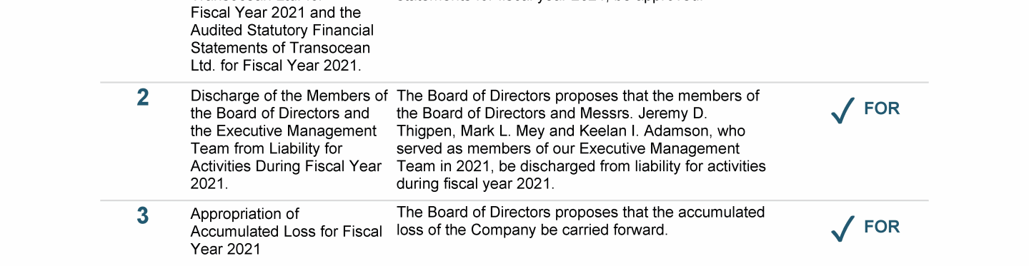 Agenda Item 1. Approval of the 2021 Annual Report, Including the Audited Consolidated Financial Statements of Transocean Ltd. for Fiscal Year 2021 and the Audited Statutory Financial Statements of Transocean Ltd. for Fiscal Year 2021