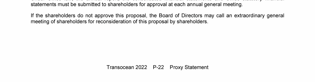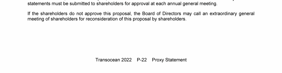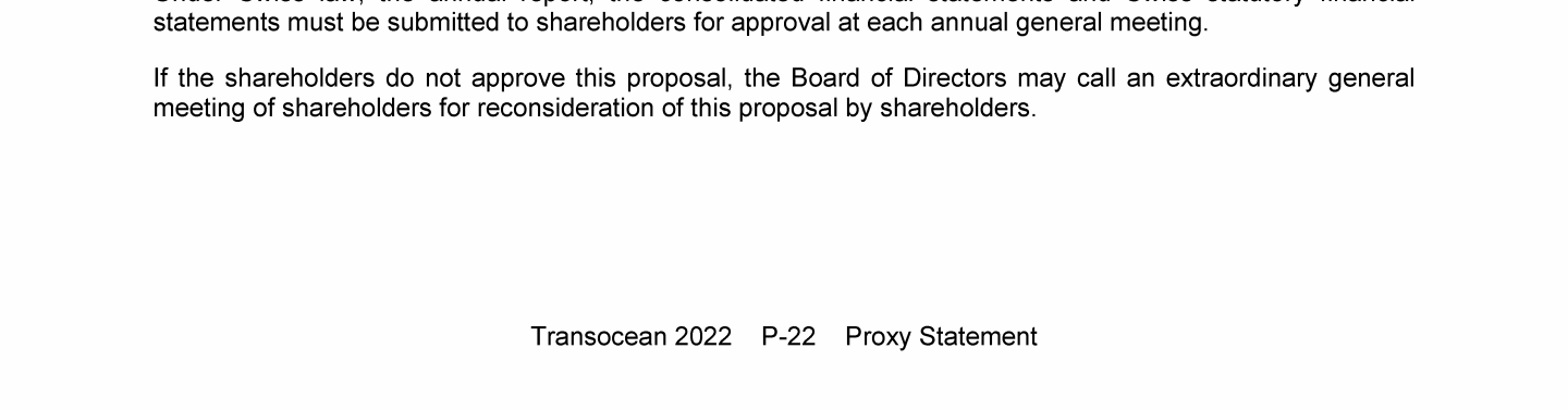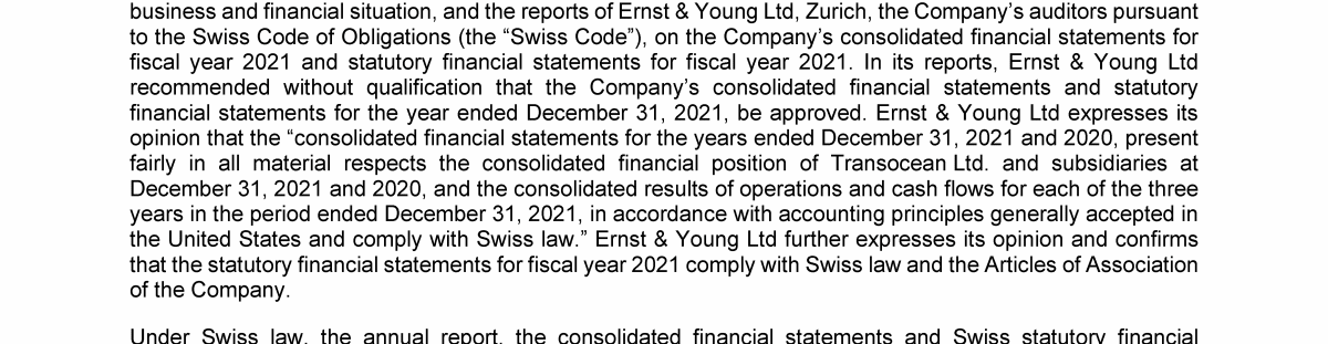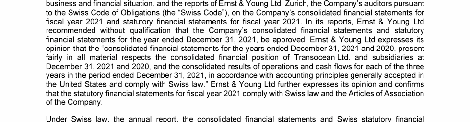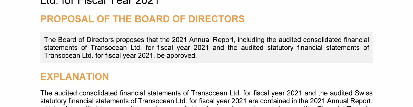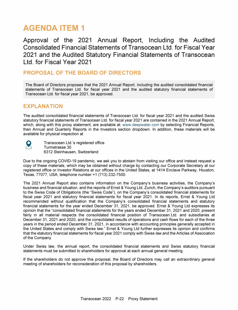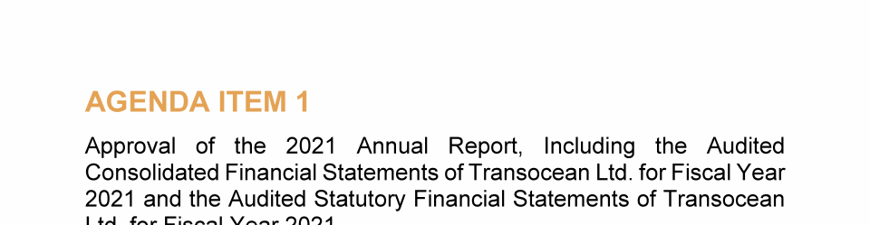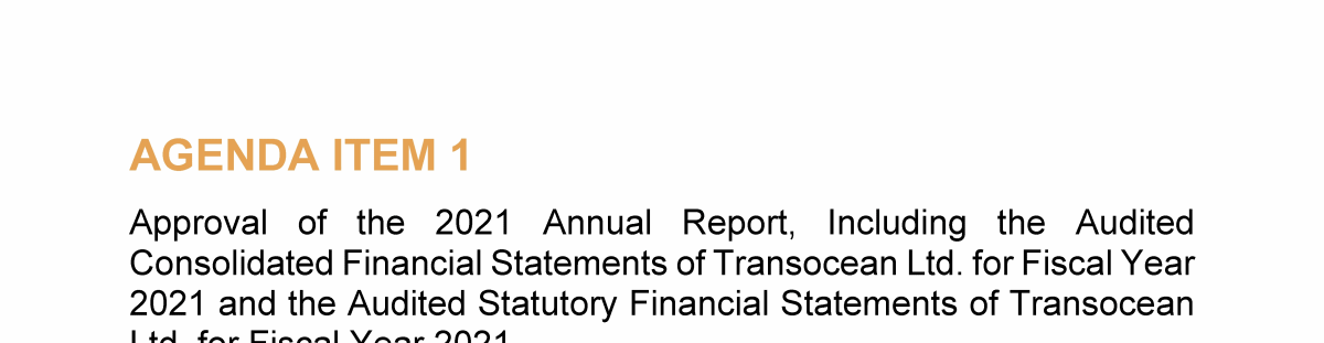 Agenda Item 1. Approval of the 2021 Annual Report, Including the Audited Consolidated Financial Statements of Transocean Ltd. for Fiscal Year 2021 and the Audited Statutory Financial Statements of Transocean Ltd. for Fiscal Year 2021