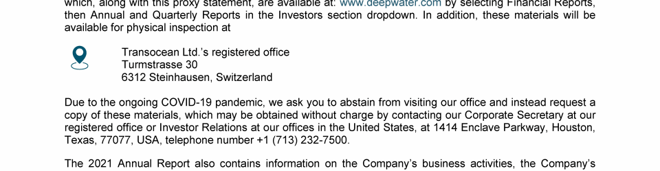 Invitation to 2022 Annual General Meeting of Transocean Ltd.
