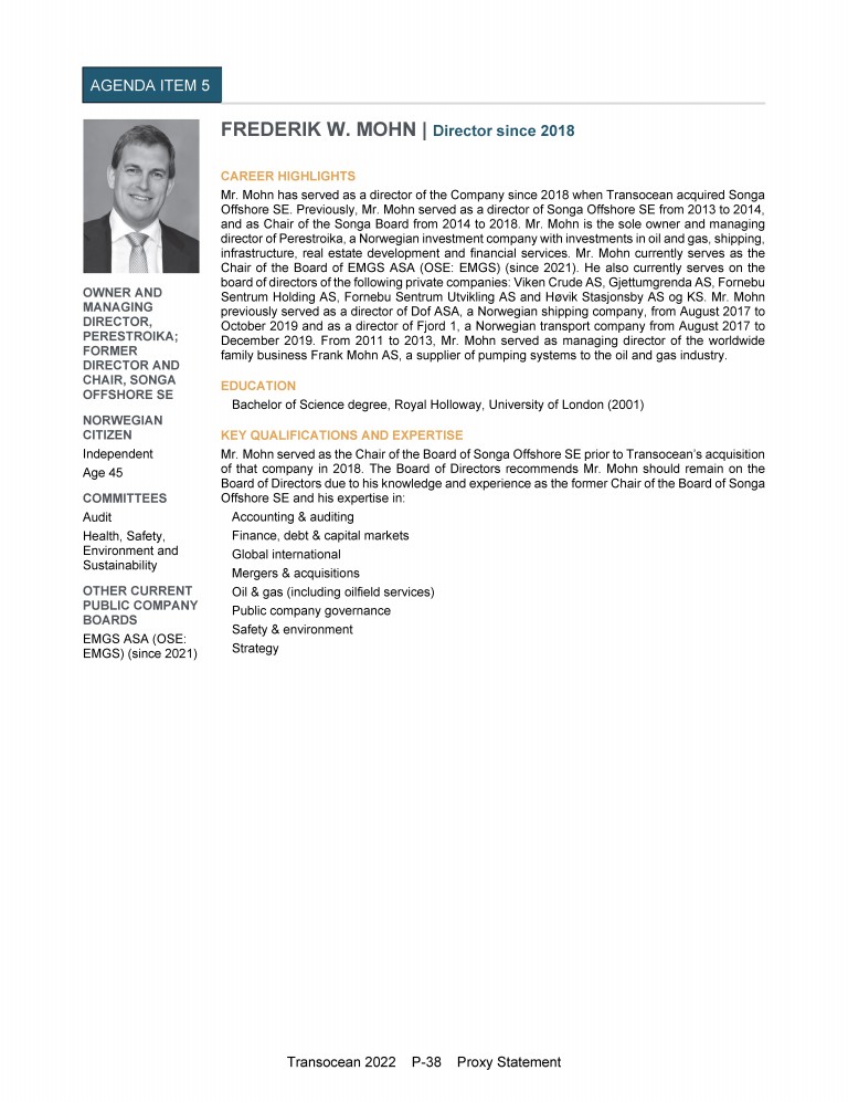 Agenda Item 1. Approval of the 2021 Annual Report, Including the Audited Consolidated Financial Statements of Transocean Ltd. for Fiscal Year 2021 and the Audited Statutory Financial Statements of Transocean Ltd. for Fiscal Year 2021
