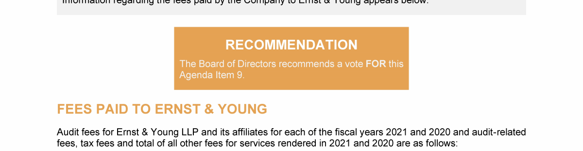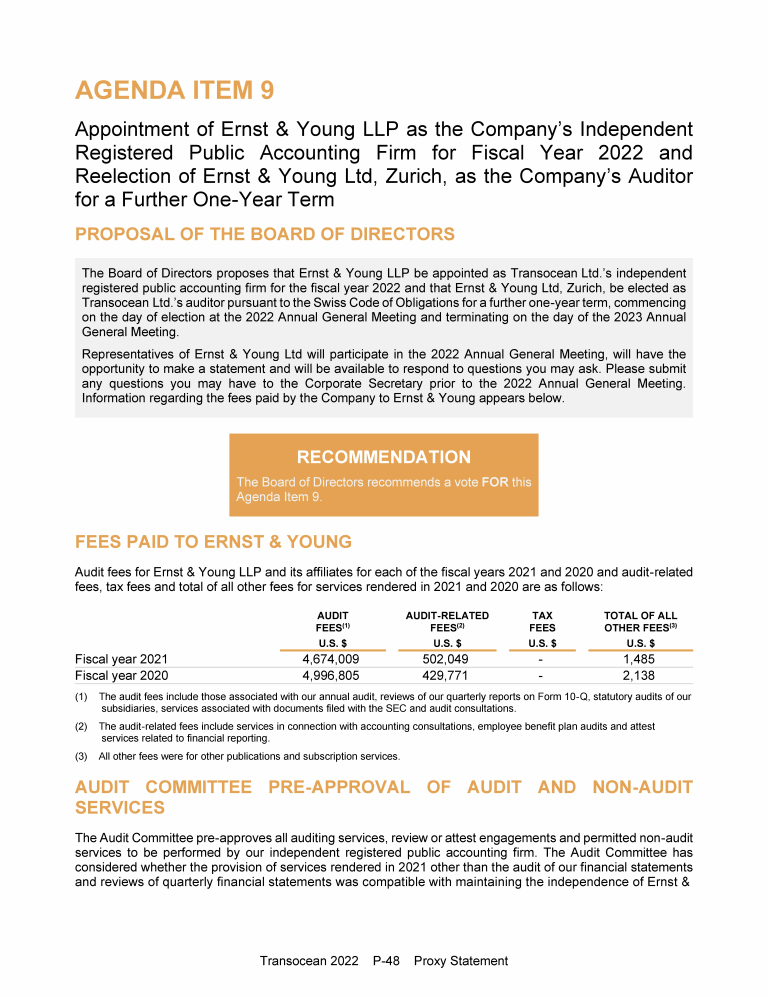 Agenda Item 9. Appointment of Ernst & Young LLP as the Company's Independent Registered Public Accounting Firm for Fiscal Year 2022 and Reelection of Ernst & Young Ltd, Zurich, as the Company's Auditor for a Further One-Year Term