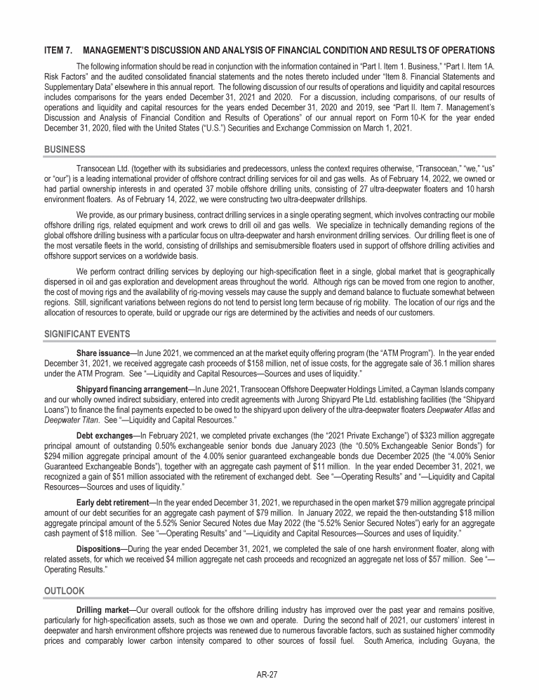 Agenda Item 1. Approval of the 2021 Annual Report, Including the Audited Consolidated Financial Statements of Transocean Ltd. for Fiscal Year 2021 and the Audited Statutory Financial Statements of Transocean Ltd. for Fiscal Year 2021
