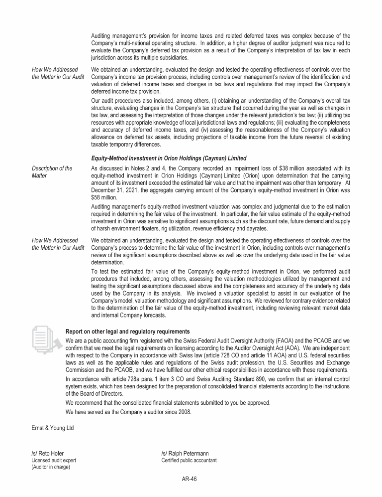 Agenda Item 1. Approval of the 2021 Annual Report, Including the Audited Consolidated Financial Statements of Transocean Ltd. for Fiscal Year 2021 and the Audited Statutory Financial Statements of Transocean Ltd. for Fiscal Year 2021