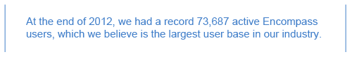 In light of the almost 40% increase in our user base and the nearly doubling of our revenues in 2012, we have undertaken a number of initiatives to support our growth and accommodate our expanding user base. In 2012, we redesigned and upgraded all of our data centers to significantly increase the capacity and the reliability of our on-demand offerings. We added, and will continue to add, to our research and development and SaaS teams and expanded our implementation and customer support teams to handle the increase in new Encompass subscribers and the expected growth in users over the next few years.