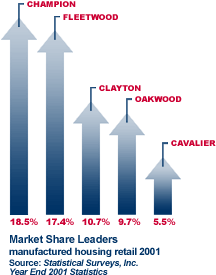 Retail sales of Fleetwood homes totaled 32,348 in calendar 2001, off 34 percent from the prior year. We ended the year with retail market share of 17.4 percent—a higher percentage than our wholesale market share, which reflects our successful actions to reduce inventory on our retailers’ lots.