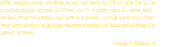 Like many large financial institutions, Zions has also been actively acquiring other banksas many as twelve in one eighteen-month period. While ADS consultants were working on some merger-related issues in 2000, the discussion turned to the company's Customer Relationship Management (CRM) efforts. Zions' officials reported that they had invested in a CRM data repository solution but its implementation had been slowed by merger-related activities and there were several issues limiting its full potential.