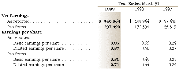 The maximum number of shares for which additional options may be granted was 13,306,421 at March 31, 1999, 13,401,204 at March 31,1998 and 5,440,736 at March 31, 1997. At March 31, 1999, a total of 62,107,843 shares of the Company's common stock are reserved for issuance under all option plans. Income tax benefits associated with the exercise of stock options are reflected as adjustments to additional paid-in capital. |