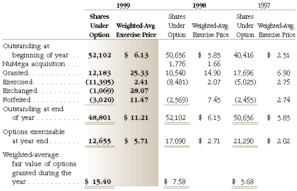 The pro forma amounts for compensation cost may not be indicative of the effects on net earnings and earnings per share for future years. Under SFAS No. 123, the fair value of each option grant is estimated on the date of grant using the Black-Scholes option-pricing model with the following weighted-average assumptions for grants in 1999, 1998 and 1997, respectively: expected volatility of 66.88, 51.50 and 55.22 percent; risk-free interest rates of 5.3, 5.7 and 6.6 percent; and expected lives at date of grant of 4.9, 4.9 and 4.3 years. Dividend yields were not a factor as the Company has never issued cash dividends and has no plans to do so in the future. Under SFAS No. 123, the fair value of the employees' stock purchase rights were estimated using the Black-Scholes model with assumptions that, except for an expected life of six months and a risk-free interest rate of 4.93% for fiscal 1999, and expected volatilities of 54.25 and 66.21 for the first and second offering periods, respectively, were consistent with those used for the Company's stock option plans described above. The weighted-average fair value of those purchase rights granted in fiscal 1999 were $6.48. A summary of the status of fixed stock option grants under Compuware's stock-based compensation plans as of March 31, 1999, 1998 and 1997, and changes during the years ending on those dates is as follows (shares in thousands):