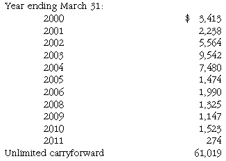 At March 31, 1999 the Company has net operating loss carryforwards for income tax purposes of approximately $96,989,000 which expire as follows (in thousands):