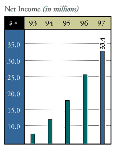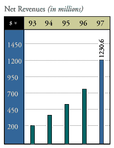 In 1997, our revenues were $1.2 billion, a 59.1 percent increase over 1996's $773.6 million. Net income for the year was $33.4 million, an increase of 27.9 percent. On a diluted earnings per share basis, net income rose 26.3 percent to $2.02 per share from $1.60 in 1996. Our cash, cash equivalents and investment balances were $122.1 million, compared with our prior year's balance of $79.6