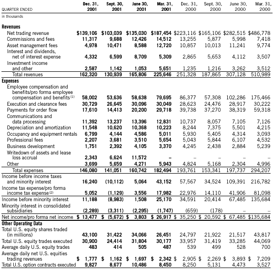 | The following table sets forth certain unaudited consolidated quarterly statement of income data and certain unaudited consolidated quarterly operating data for the years ended December 31, 2001 and 2000. In the opinion of our management, this unaudited information has been prepared on substantially the same basis as the consolidated financial statements appearing elsewhere in this annual report and includes all adjustments (consisting of normal recurring adjustments) necessary to present fairly the unaudited consolidated quarterly data. The unaudited consolidated quarterly data should be read in conjunction with the audited Consolidated Financial Statements and Notes thereto appearing elsewhere in this annual report. The results of any quarter are not necessarily indicative of results for any future period. ![]() Certain prior quarter amounts have been reclassified to conform to current year presentation. (1) Before our merger, Arbitrade was a limited liability company and compensation and benefits to Arbitrade’s members was accounted for as distributions of members’ equity. Pro forma compensation expense was computed as 15% of the before-tax profits earned by Arbitrade for the period ended January 12, 2000, the date of the merger. (2) Before our merger with Arbitrade, Arbitrade was a limited liability company and was not subject to income taxes. Of the $81,098 in income taxes for the quarter ended March 31, 2000, $643 represents pro forma income taxes for the period from January 1, 2000 through January 12, 2000, and $80,455 represents actual income taxes for the period from January 13, 2000 through March 31, 2000. The income tax amounts for subsequent quarters represent actual income taxes. See Note 15 of the Notes to Consolidated Financial Statements. |