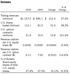 | YEARS ENDED DECEMBER 31, 2000 AND 1999 In 2000, we had gross revenues of $1,257.3 million, up from $896.6 million in 1999. Our total expenses were $838.8 million, up from $573.7 million in 1999. Our 2000 net income was $259.9 million, resulting in an EPS on a fully diluted basis of $2.05. This compares to net income of $211.3 million and an EPS of $1.68 on a fully diluted basis in 1999. Our international expansion efforts resulted in a $0.05 charge to our EPS in 2000. ![]() Our net trading revenue from equity security marketmaking increased 32.3% to $1,020.9 million in 2000, from $771.4 million in 1999. This increase was primarily due to higher U.S. equity share volume, particularly in OTC securities. U.S. equity trading revenue represents the majority of our equity market-making revenue. Total U.S. equity share volume increased 38.3% to 112.1 billion shares in 2000, from 81.0 billion shares in 1999. The effect of this increase was offset, slightly, by the decrease in average revenue capture per U.S. equity share which decreased from $0.0095 per U.S. equity share in 1999 to $0.0092 per U.S. equity share in 2000. Net trading revenue from options market-making increased 85.4% to $136.6 million in 2000, from $73.7 million in 1999. The increase is due to higher U.S. option contract volume, offset by lower average revenue capture per U.S. option contract. Total U.S. option contract volume was positively impacted by KFP's purchases of additional exchange posts during 2000, which increased our options market-making coverage. Total U.S. option contract volume increased 101.6% to 21.4 million contracts in 2000, from 10.6 million contracts in 1999. The increase was partially offset by the decrease in average revenue capture per U.S. option contract, which decreased to $6.11 in 2000, from $7.02 in 1999. Commissions and fees increased 98.0% to $32.5 million in 2000, from $16.4 million in 1999. This increase is primarily due to higher U.S. equity share volumes from institutional customers in listed securities, higher fees for providing certain information to market data providers and for directing trades to certain destinations for execution. Our asset management fees increased 110.2% to $41.9 million in 2000 from $19.9 million in 1999. The increase in fees was primarily due to an increase in fund returns from 21.08% in 1999 to 33.61% in 2000. Additionally, there was an increase in funds under management from $314.3 million at December 31, 1999 to $743.5 million at December 31, 2000. Interest income, net of interest expense, increased 35.0% to $16.1 million in 2000, from $11.9 million in 1999. This increase was primarily due to larger cash balances held at banks and our clearing brokers. Investment income and other income increased 191.9% to $9.2 million in 2000, from $3.2 million in 1999. This increase was primarily due to an increase in income from our investments, primarily our investments in the private investment fund that we sponsor and manage. Expenses Pro forma employee compensation and benefits expense increased 52.3% to $421.4 million in 2000, from $276.8 million in 1999. As a percentage of total revenue, pro forma employee compensation and benefits expense increased to 33.5% in 2000 from 30.8% in 1999. The increase on a dollar basis was primarily due to increases in gross trading revenue and growth in our number of employees. The increase on a percentage basis is primarily due to an increase in our number of employees and the decrease in average revenue capture per U.S. equity share and U.S. option contract. Due to increased net trading revenue and profitability, pro forma profitability based compensation increased 46.4% to $331.8 million in 2000, from $226.6 million in 1999. The number of employees increased to 1,364 employees as of December 31, 2000, from 803 employees as of December 31, 1999. Execution and clearance fees increased 25.3% to $112.2 million in 2000, from $89.6 million in 1999. As a percentage of total revenue, execution and clearance fees decreased to 8.9% in 2000 from 10.0% in 1999. The increase on a dollar basis was primarily due to a 57.4% increase in U.S. equity trades executed to 142.7 million U.S. equity trades in 2000, from 90.7million U.S. equity trades in 1999 and the 101.6% growth in U.S. options contracts executed. The increase on a dollar basis was offset, in part, by a decrease in clearance rates charged by clearing brokers and volume discounts. The decrease in execution and clearance fees as a percentage of total revenue was primarily due to the decrease in clearance rates charged by clearing brokers, volume discounts and growth in the volume of OTC securities transactions. Payments for order flow increased 25.9% to $174.6 million in 2000, from $138.7 million in 1999. As a percentage of total revenue, payments for order flow decreased to 13.9% in 2000 from 15.5% in 1999. The increase in payments for order flow on a dollar basis was primarily due to the 38.3% increase in U.S. equity shares traded in 2000 and the introduction of payments for order flow for options during the third quarter of 2000. The decrease in payments for order flow as a percentage of total revenue was primarily due to increases in our institutional, asset management and options revenues, respectively, which have less payments for order flow associated with them. Communications and data processing expense increased 74.3% to $33.0 million in 2000, from $18.9 million in 1999. This increase was generally attributable to higher trading volumes, a growth in our options business and an increase in the number of employees. Depreciation and amortization expense increased 122.3% to $25.3 million in 2000, from $11.4 million in 1999. This increase was primarily due to the purchase of approximately $71.0 million of additional fixed assets and leasehold improvements during 2000 and the amortization of goodwill and intangible assets primarily related to the acquisition of the listed securities market-m