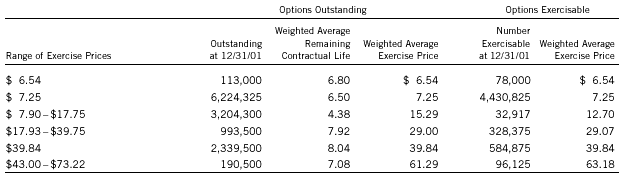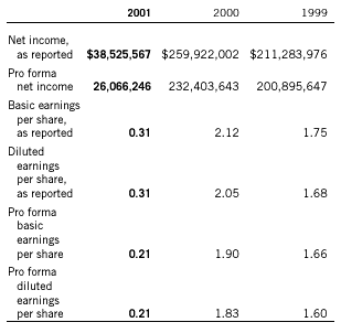 | NOTE 16: LONG-TERM INCENTIVE PLANS The Company established the Knight/Trimark Group, Inc. 1998 Long-Term Incentive Plan and the Knight/Trimark Group, Inc. 1998 Nonemployee Director Stock Option Plan (together, the “Plans”) to provide long-term incentive compensation to selected employees and directors of Knight Trading Group and its subsidiaries. The Plans are administered by the compensation committee of the Company’s Board of Directors, and allow for the grant of options, restricted stock and restricted stock units, as defined by the Plans. Including a stockholder-approved increase in the number of shares reserved under the Plans by three million in May 2001, the maximum number of shares of Class A Common Stock reserved for the grant of options under the Plans is 27,819,000, subject to adjustment. The maximum number of restricted stock and restricted stock units which may be issued under each of the Plans is 3,000,000, which includes a two million share increase reserved under the Plans that was approved by stockholders in May 2001. In addition, the Plans limit the number of shares which may be granted to a single individual, and the Plans also limit the number of shares of restricted stock that may be awarded. It is the Company’s policy to grant options for the purchase of shares of Class A Common Stock at not less than market value, which the Plans define as the average of the high and low sales prices on the date prior to the grant date. Options and awards generally vest over a three or four-year period and expire on the fifth or tenth anniversary of the grant date, pursuant to the terms of the agreements. The Company has the right to fully vest employees in their option grants and awards upon retirement. The following is a reconciliation of option activity for the Plans for the years ended December 31, 2001 and 2000, and a summary of options outstanding and exercisable at December 31, 2001: ![]() ![]() The Company granted a total of 72,240 restricted shares of Class A Common Stock to certain employees of the Company under the 1998 Long-Term Incentive Plan and recorded compensation expense of $173,599 during 2001 for the fair value of the shares, which has been included in Compensation and Benefits in the Consolidated Statements of Income. The unamortized portion of the restricted shares is recognized as compensation expense over the vesting period. The restricted stock requires future service as a condition of the underlying shares of common stock. The Company applies Accounting Principles Board Opinion No. 25, Accounting for Stock Issued to Employees and related interpretations in accounting for its stock option plans. Accordingly, no compensation expense has been recognized for the fair values of the options granted to employees. Had compensation expense for the Company’s options been determined based on the fair value at the grant dates in accordance with Statement of Financial Accounting Standards No. 123, Accounting for Stock-Based Compensation, the Company’s net income and earnings per share amounts for the years ended December 31, 2001, 2000 and 1999 would have been as follows: The fair value of each option granted is estimated as of its respective grant date using the Black-Scholes option-pricing model with the following assumptions: ![]() |