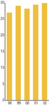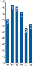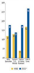 One of the few bright spots in the U.S. industrial economy in 2002 was the continued gains in the home building and remodeling market. Demand for wallboard facings grew 1.8 percent in 2002, and more importantly, has increased 17 percent over the last five years. The rebuild of Caraustar's joint venture mill in Indiana, PBL, realized a 44 percent increase in its output of gypsum facing paper in 2002.