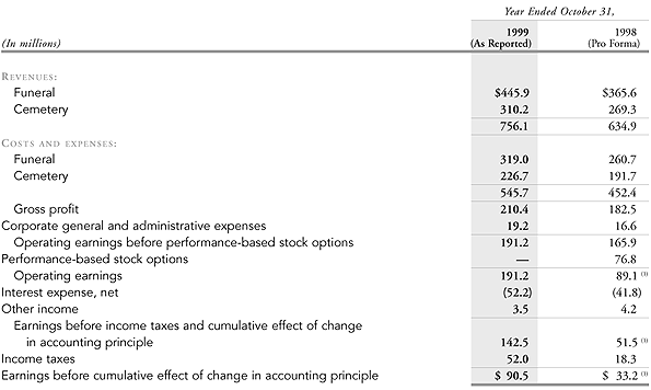 of Operations Comparisons between fiscal years 1999 and 1998 reflect the pro forma effects of applying the new accounting principle as if the change had occurred on November 1, 1997; whereas, comparisons between fiscal years 1998 and 1997 are presented as originally reported. The following table presents the results as reported for the fiscal year ended October 31, 1999 and the pro forma results for the year ended October 31, 1998: