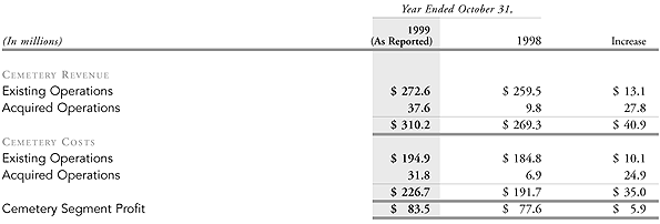 October 31, 1999 Compared to Year Ended October 31, 1998 Cemetery revenue increased $40.9 million, or 15 percent, for the year ended October 31, 1999, compared to the corresponding period in 1998. The $13.1 million, or 5 percent, increase in revenue from Existing Operations resulted primarily from an increase in preneed cemetery sales, price increases and improved merchandising, coupled with an increase in the revenue realized from the Company's cemetery trust funds and escrow accounts. The revenue from the cemetery trust funds and escrow accounts increased $3.6 million, or 14 percent, to $29.4 million due to a 20 percent growth in the average balance in the funds, resulting from current year customer payments deposited into the funds and funds added through acquisitions, coupled with an increase in the average yield on the funds. The yield was in line with the Company's goal of 8.5 percent to 9.0 percent. Cemetery profit margin from Existing Operations decreased from 28.8 percent in 1998 to 28.5 percent in 1999. This decline was attributable principally to a savings rebate received by the Company from contract negotiations with a primary vendor in 1998 which was not obtained in 1999. The increase in revenue and costs from Acquired Operations resulted primarily from the Company's acquisition of cemeteries during fiscal year 1999, which are not reflected in the 1998 period presented above.