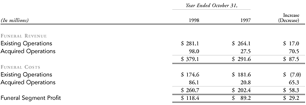 in 1998. The $7.0 million, or 4 percent, decrease in funeral costs from