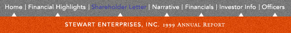 Strategies Of the 100 businesses we purchased in fiscal 1999, one stands out as our largest domestic acquisition to date. D. W. Newcomer's Sons, Inc. came on board in the second quarter with eight funeral homes, four cemeteries and seven combination operations operating in Missouri, Kansas and Iowa. The addition of these funeral homes and cemeteries significantly expanded our operations in the Midwest. At the same time, we entered the Wisconsin market through the acquisition of the magnificent Wisconsin Memorial Park in Milwaukee. These two businesses, which enjoy outstanding reputations in our industry, enabled us to increase the number of families we serve each year by nearly 8,700. In previous annual reports, we discussed key initiatives we have launched to promote internal growth and make our operations more efficient. These initiatives include the development of alternative-services firms, expansion of our office automation systems and formation of operating partnerships with third parties. As you read this annual report, you will learn of our plans in each of these areas for the coming year. More importantly, you will learn about our business plans to enhance revenues, profits and cash flow at existing operations, and to grow our business through means other than acquisitions. We took an important step in the third quarter when we launched Project 2000, a comprehensive national study of consumer preferences related to the total death care industry. We expect to receive the results of this study in early 2000, and believe they will help us evaluate the public's changing attitudes regarding pricing, merchandising and services. In the fourth quarter, we adopted a new accounting method under which all earnings on the trust funds set up for prearranged funerals will be deferred until the delivery of the related funeral service. The new method matches revenue recognition more closely with cash receipts and improves the comparability of our earnings with those of our principal competitors. The change has been well received by the investment community. New Leadership