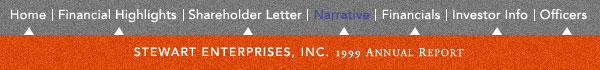 Selling prearranged death care products and services builds tomorrow's market share today. Stewart has had more than a half-century of experience in helping families make prearrangements. The Company employs over 3,500 dedicated sales professionals and utilizes well-developed, field-tested professional marketing programs. New marketing programs are tested continually and implemented when appropriate. At the close of fiscal year 1999, our backlog of prearranged funeral services exceeded 436,000, representing more than $1.5 billion in anticipated future revenue. Investing in the training of our sales force and cemetery and funeral home employees is always important, but it becomes even more vital during times of change. The responsibility for training is now being centralized, and a formal training policy will be developed in the course of the year. In 1979, we developed the Company's first combination operation (and the first in Louisiana) when we constructed Lake Lawn Metairie Funeral Home in Metairie Cemetery (acquired in 1969). We recently completed an addition to that funeral home to better serve the many families it assists annually the largest number of any funeral home in the state. Today, 44% of our cemeteries operate in conjunction with funeral homes. The Company's experience has demonstrated that the combination of a funeral home with a cemetery can significantly increase the market share and profitability of both. We have developed two internal growth strategies that employ the use of combination operations. Not only have we constructed funeral homes on the grounds of our own cemeteries, but we have also entered into alliances to construct and operate funeral homes on the grounds of others' cemeteries. During fiscal 1999, construction was under way on four funeral homes being built by Stewart on cemeteries owned by the Archdiocese of Los Angeles. The first of these facilities opened and began serving families in January 2000. The same month saw the completion and opening of Wyuka Funeral Home in Wyuka Cemetery, a state-chartered cemetery in Lincoln, Nebraska. Entering into such partnerships enables us to obtain market share at a substantially lower cost than we could through acquisitions or cemetery development. As we grew our business through acquisitions, we selected funeral homes and cemeteries that were among the most highly regarded in the area, with outstanding reputations. Our acquisition strategy also took into account the potential for market clustering (operation of multiple businesses in close geographic proximity), which enables us to achieve economies of scale. We plan to expand on our cluster concept and leverage goodwill through market-wide regional branding. This will involve, in selected areas, associating the name of a leading firm in a cluster with the names of other firms in that cluster. Because customer service and loyalty remain keys to success in our industry, using the goodwill of our market leader in selected areas is expected to increase market share. In fact, we are experiencing success in several of our larger markets Orlando and Tampa, Florida, and San Diego, California where we have already positioned ourselves as a regional brand. We added alternative-services firms to our business in fiscal year 1997 with the acquisition of Sentinel Cremation Societies, Inc. of California. Sentinel serves families through the brand names Neptune Society of Northern California and Telophase Society. The following year, the Company acquired Desert Memorial Cremation in Las Vegas, Nevada, a state with one of the highest cremation rates in the United States. Because a typical cremation society office is located in leased space of 1,000 to 2,000 square feet and is staffed by two employees handling 500 families annually, the alternative-services-firm concept represents a cost-effective method of entering new markets and growing in existing markets. We are developing a business plan for expanding this part of our business in upcoming years and expect to integrate results of the Project 2000 study into the plan this year and beyond. During 2000, the Company plans to automate all of its funeral businesses with real-time and standardized information. We took the first step toward this goal in 1996 with the establishment of our Shared Services Center. The Center, located in New Orleans, performs all of the accounting and administrative functions for Stewart's U.S. and Puerto Rican operations and has been effective in controlling costs and improving customer service. In 1997, we began development of two major software packages: Cemetery and Funeral Home Enabler (CAFE) and Key Information for Sales (KIS). CAFE is a PC-based data-capture system that automates the process of arranging for funerals and burials, eliminates duplicate data entry, delivers the latest information to the desktop at all our locations, and generates reports. KIS tracks, processes and presents key sales data, and provides management with real-time access to the data. Rollout of these two technologies will be completed by June 2000. Improved service to client families through decreased errors in contracts is already evident in areas that have been fully automated. Top - History - Positioned to Change - Existing Strategies - New Strategies - Need for Service Opportunities