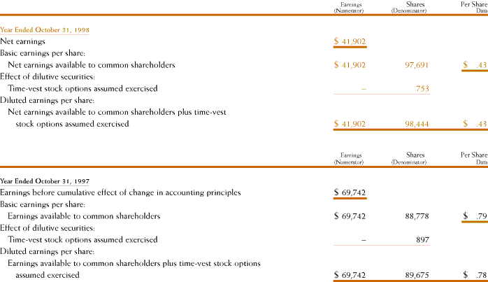 Options to purchase 319,210 shares of common stock at $25.81 and 895,560 shares of common stock at $27.25 were outstanding during the third and fourth quarters of fiscal year 1998 but were not included in the computation of diluted earnings per share because the options' exercise prices were greater than the average market price of the common shares. The options, which expire on July 31, 2004, were still outstanding at the end of fiscal year 1998.