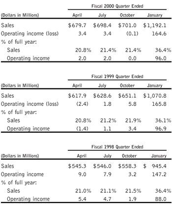 Seasonality The Companys business is highly seasonal, with sales significantly higher and substantially all operating income realized during the fourth quarter, which includes the Christmas selling season. The information below excludes discontinued operations and asset impairments and other writedowns.
