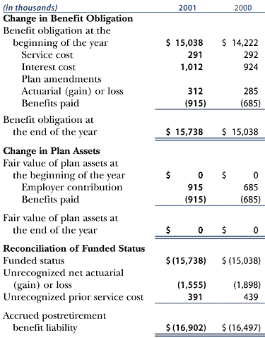 of the funded status at December 31, 2001 and 2000, are as follows: