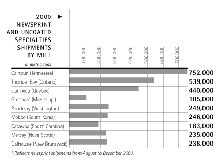 Bowaters Newsprint Division is responsible for the operation of eight facilities in the United States, Canada and South Korea. The largest newsprint manufacturer in the United States, Bowater grew again in 2000 with the purchase of a 250,000 metric ton newsprint mill in Grenada, Mississippi. This facility allows Bowater to better serve the growing Southwestern United States market, while enabling us to improve operating margins through better freight efficiencies at our other North American mills.
