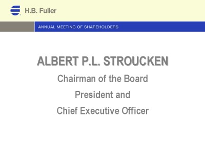 AS IN PREVIOUS YEARS, I WOULD LIKE TO BEGIN OUR MEETING BY INTRODUCING MY COLLEAGUES ON H.B. FULLER’S BOARD OF DIRECTORS. I’LL ASK THE DIRECTORS TO STAND AS I CALL THEIR NAMES. PLEASE HOLD YOUR APPLAUSE UNTIL ALL HAVE BEEN INTRODUCED.