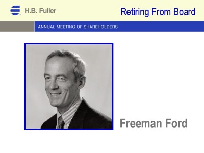 FREEMAN FORD JOINED THE FULLER BOARD OF DIRECTORS IN 1975, AND HAS SERVED ON THE FINANCE AND AUDIT COMMITTEES SINCE THE MID-’70s, AND IN RECENT YEARS HAS SERVED AS CHAIR OF THE FINANCE COMMITTEE. HE HAS ALSO BEEN A MEMBER OF THE COMPENSATION AND STRATEGIC PLANNING COMMITTEES DURING HIS TENURE. FREEMAN, WHO IS CHAIRMAN AND CHIEF EXECUTIVE OFFICER OF FAFCO, A MANUFACTURER OF ENERGY CONSERVATION EQUIPMENT BASED IN CHICO, CALIFORNIA, HAS BROUGHT KEY BUSINESS PERSPECTIVE AND INSIGHT OVER THE YEARS.
