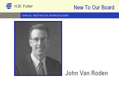 NEW TO OUR BOARD THIS YEAR IS JOHN VAN RODEN. JOHN, WHO JOINED US IN DECEMBER 2003, IS SENIOR VICE PRESIDENT AND CHIEF FINANCIAL OFFICER AT GLATFELTER, INC., A SPECIALTY PAPER PRODUCER LOCATED IN YORK, PENNSYLVANIA, WHERE HE OVERSEES TREASURY, ACCOUNTING, TAXES, INTERNAL AUDIT, INVESTOR RELATIONS, STRATEGIC PLANNNING AND INFORMATION TECHNOLOGY FUNCTIONS. PRIOR TO JOINING GLATFELTER, JOHN SERVED AS SENIOR VICE PRESIDENT AND CHIEF FINANCIAL OFFICER FOR CONECTIVE, A $5 BILLION ENERGY COMPANY, AND AT LUKENS, A $1 BILLION STEEL PRODUCER. HE IS SERVING ON THE AUDIT AND FINANCE COMMITTEES. WE ARE DELIGHTED TO HAVE HIM AND WELCOME HIS EXPERTISE. PLEASE JOIN ME IN GIVING HIM A WARM RECEPTION.