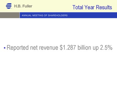 OUR REPORTED NET REVENUE OF $1.287 MILLION SHOWED A 2.5 PERCENT INCREASE OVER THE PREVIOUS YEAR. INCLUDED IN THAT WAS A DECREASE IN VOLUME AND PRICING OF 0.7 PERCENT AND 0.8 PERCENT RESPECTIVELY, WITH FAVORABLE CURRENCY EFFECTS ACCOUNTING FOR AN INCREASE OF 4.0 PERCENT IN NET REVENUE.