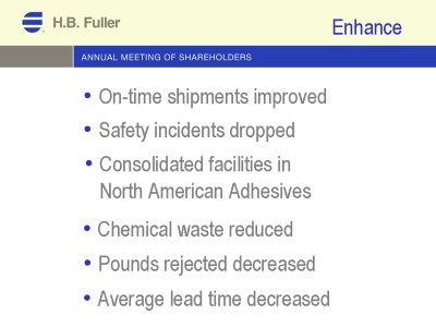 HERE ARE SOME OF THE RESULTS: OUR ON-TIME SHIPMENTS WITHIN NORTH AMERICA IMPROVED FROM 72 PERCENT IN 2000 TO OVER 99 PERCENT IN 2003. SAFETY INCIDENTS THAT HAD BEEN AS HIGH AS 126 PER YEAR IN 1996 DROPPED TO 22 LAST YEAR. WE CONSOLIDATED FACILITIES, MOVING FROM 32 IN 1995 TO 10 TODAY IN NORTH AMERICA ADHESIVES. OUR WASTE RATIO, WHICH MEASURES POUNDS OF WASTE DIVIDED BY TOTAL POUNDS PRODUCED, IMPROVED FROM 2.6 IN 1999 TO 1.39 IN 2003. CHEMICAL WASTE WAS REDUCED FROM 18.5 MILLION POUNDS IN 1996 TO 6.6 MILLION POUNDS LAST YEAR. POUNDS REJECTED DECREASED FROM 5.5 MILLION POUNDS IN 1996 TO 3 MILLION POUNDS IN 2003. POUNDS RETURNED DECREASED FROM 10.2 MILLION POUNDS IN 1996 TO 4.2 MILLION POUNDS IN 2003. OUR AVERAGE LEAD TIME DECREASED FROM 8.7 DAYS IN 1998 TO 4.5 DAYS IN 2003.