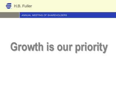I MENTIONED BEFORE THAT IN ADDITION TO HAVING DEFINED OUR VISION, WE HAVE ESTABLISHED A VERY CLEAR PRIORITY: GROWTH. THIS IS OUR NUMBER-ONE OBJECTIVE. ALTHOUGH ECONOMIC CONDITIONS IN NORTH AMERICA AND EUROPE STYMIED RESULTS IN THOSE REGIONS IN 2003, WE DID ATTAIN, AS I MENTIONED A FEW MINUTES AGO, IMPORTANT SUCCESS IN EMERGING MARKETS. WE ALSO ARE MAKING SOLID INROADS WITH A NUMBER OF OTHER GROWTH-FOCUSED INITIATIVES, YET ANOTHER REASON WHY H.B. FULLER IS AN EXCITING COMPANY. LET’S TAKE A CLOSER LOOK.